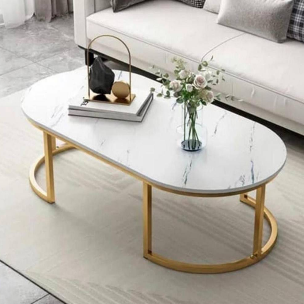 طاولة قهوة معدن وخشب رخامي مودرن لون ذهبي وابيض