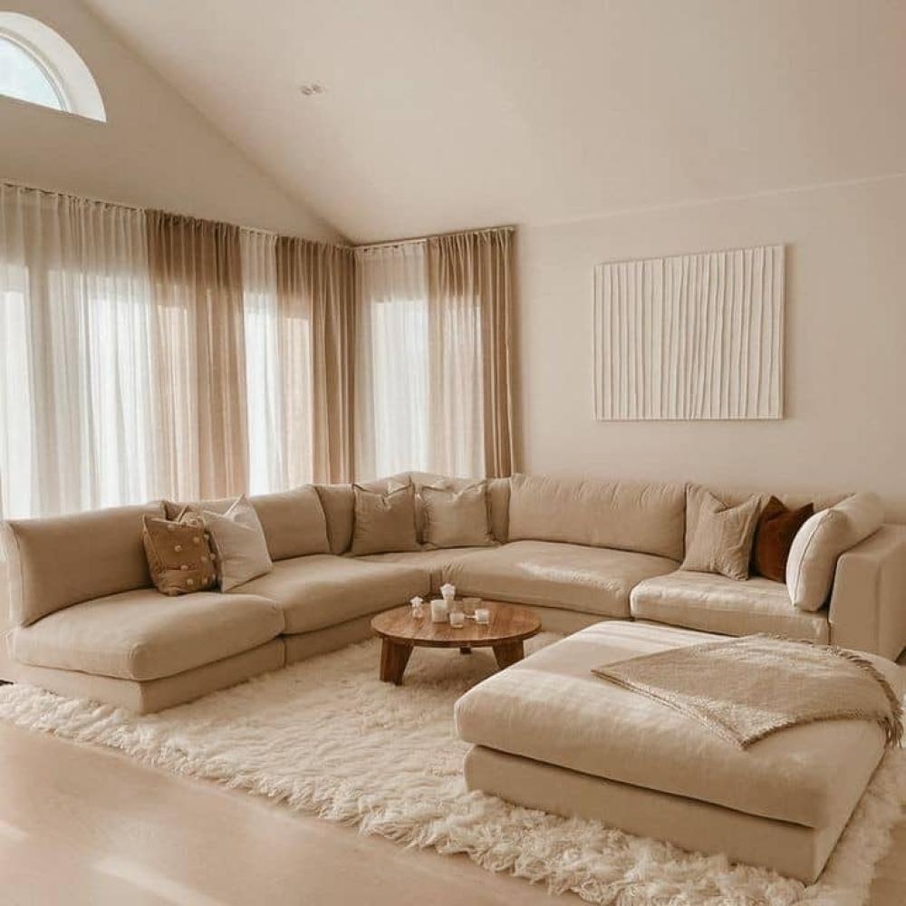 حول غرفة معيشتك إلى ملاذ للراحة والفخامة مع كنبتنا الزاوية الفاخرة بلون بيج مع بوف.
