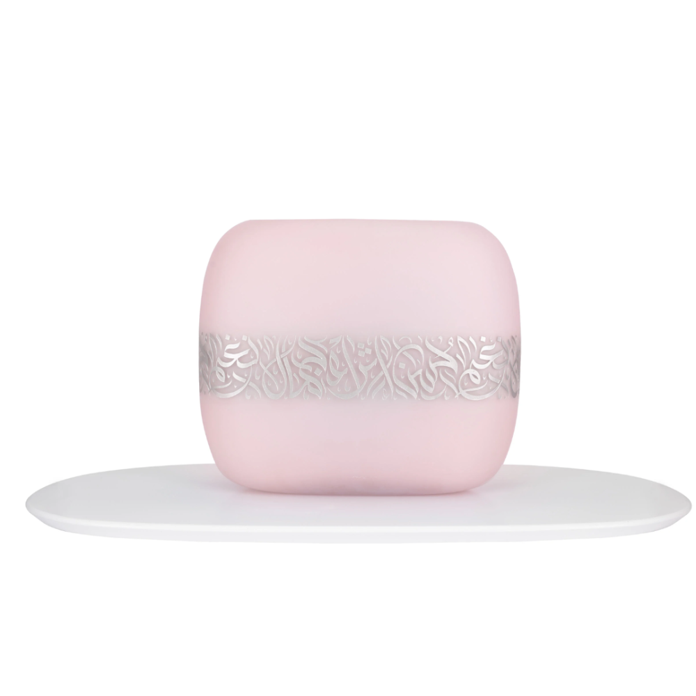 مزهرية زجاجية وردية فاخرة تصميم عصري وفريد بزخفة بلاتينية انيقة من الخط العربي