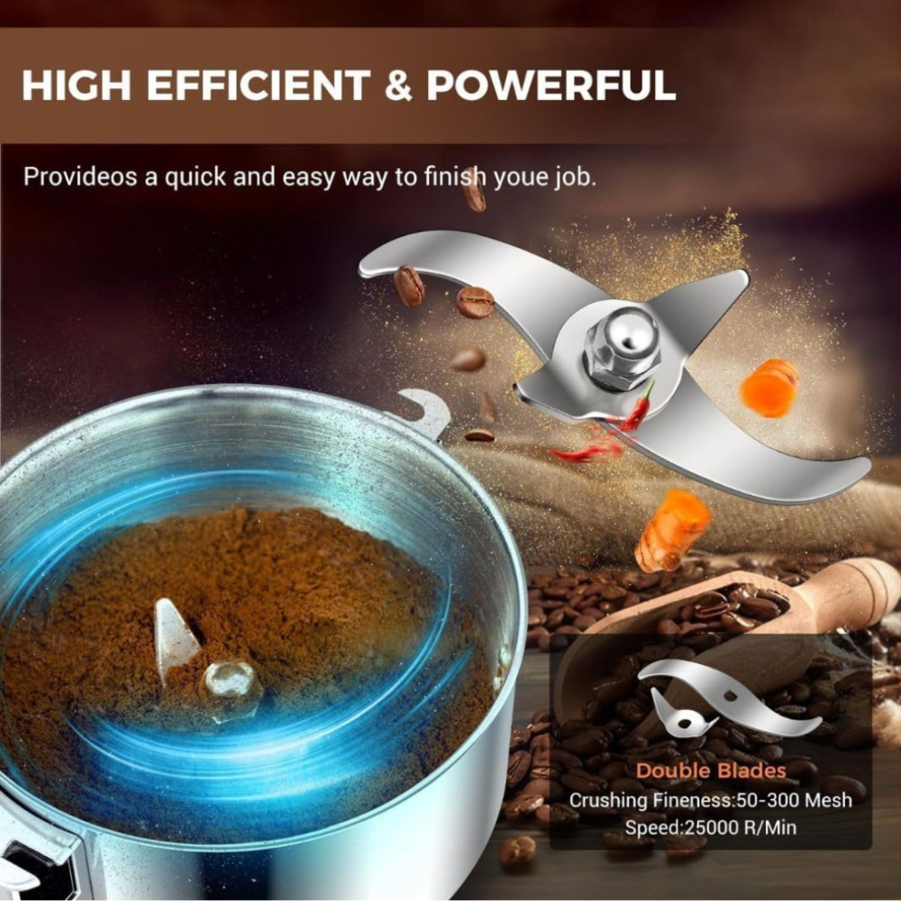 تأتي هذه المطحنة القوية بسعة 150 غرام ومحرك بقدرة 950 واط لتمنحك طحنًا سريعًا وفعالًا لحبوب القهوة، البهارات، والمكسرات، وغيرها من المكونات الجافة.