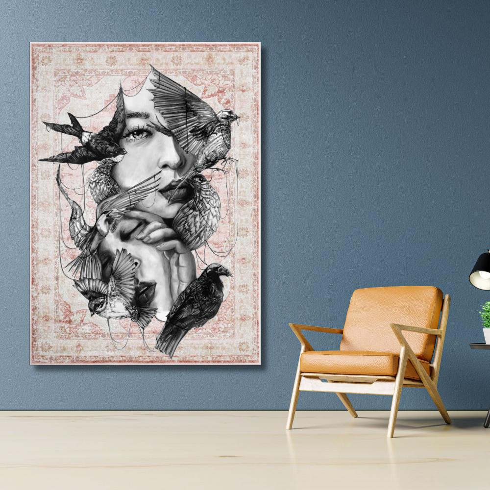 لوحة جدارية مطبوعة بخلفية سجاد وكولاج صورة وجه امرأة