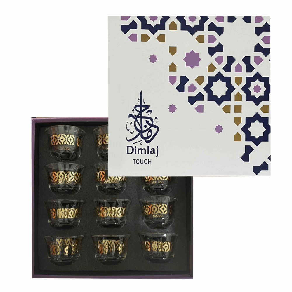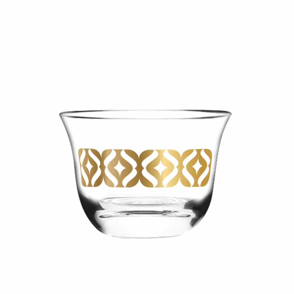 طقم فناجين قهوة عربية زجاجية مذهبة بزخرفة هندسية عصرية وانيقة