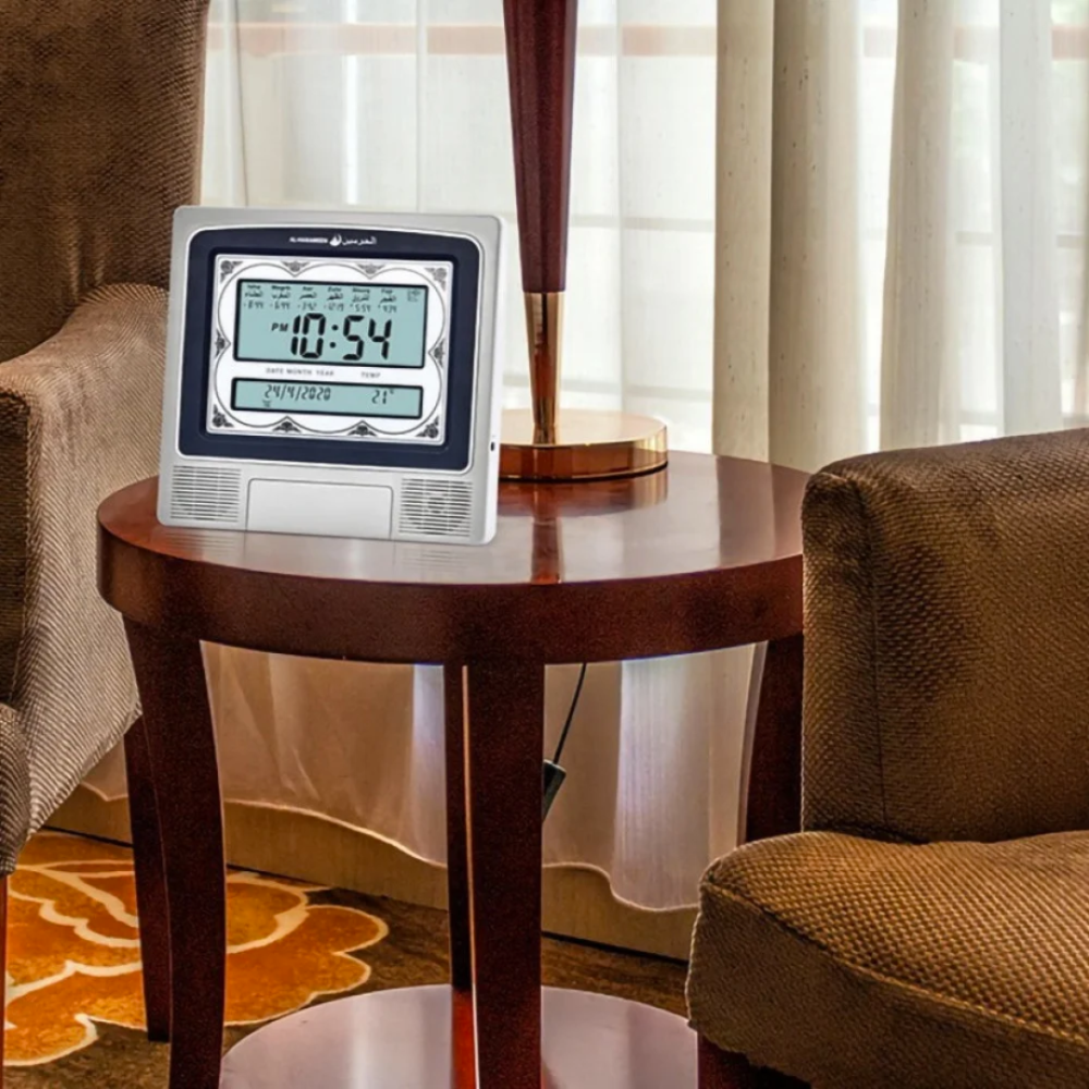 ساعة حائط وطاولة مزودة بشاشتين من الحرمين