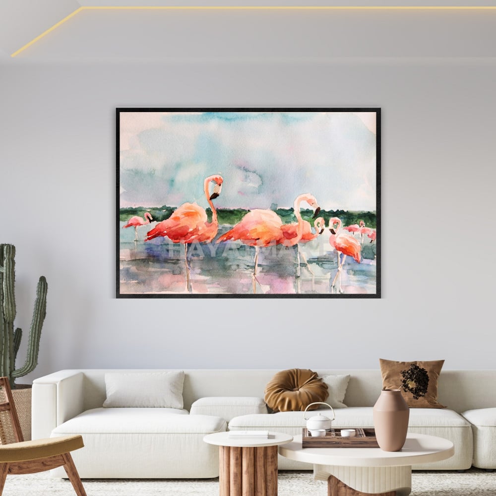 لوحة جدارية لطائر الفلامنجو مصنوعة من قماش كنفاس الايطالي لمكان اكثر فخامة تنعكس فيه الألوان والفن والجمال, طباعة عاليه الجودة بالتقنية الأسبانية الاولى على مستوى العالم, متوفرة بعدة خيارات وعدة مقاسات.