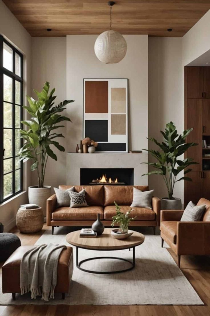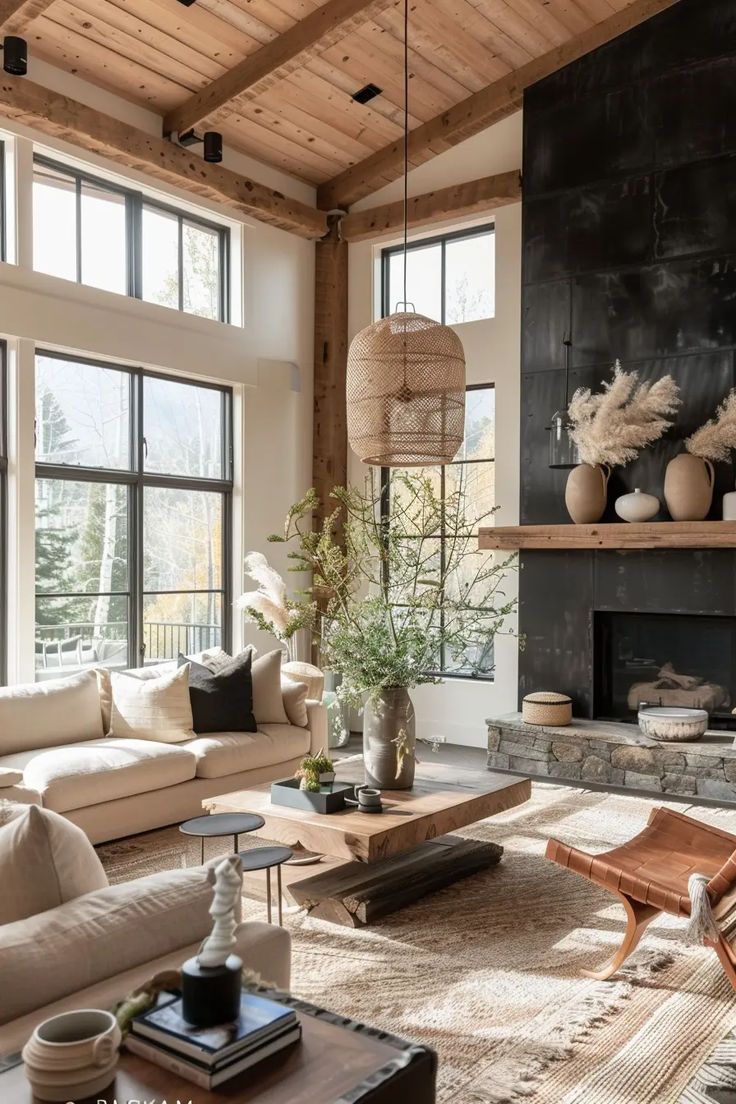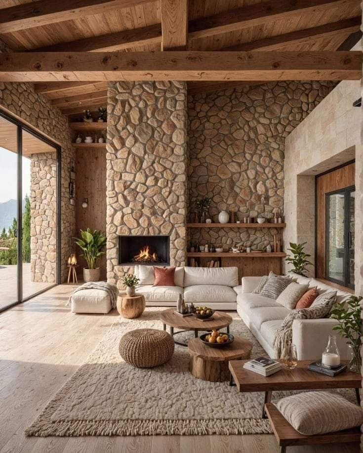 - المواد الطبيعية: استخدام الخشب في الأثاث والأرضيات، والحجر في الجدران أو الموقد، مع الحفاظ على خاماتها الطبيعية.