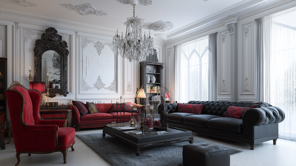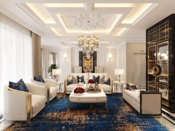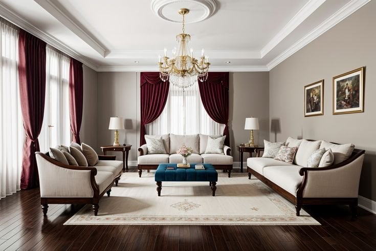الأثاث هنا غالبًا بسيط وبلون واحد محايد، مع الاعتماد على التفاصيل الصغيرة لإضفاء الفخامة. وسائد مخملية، ستائر ثقيلة بلون داكن، وسجادة فاخرة بزخارف دقيقة. قطعة فنية واحدة أو مرايا أنيقة تكفي لإبراز شخصية الصالة دون ازدحام.