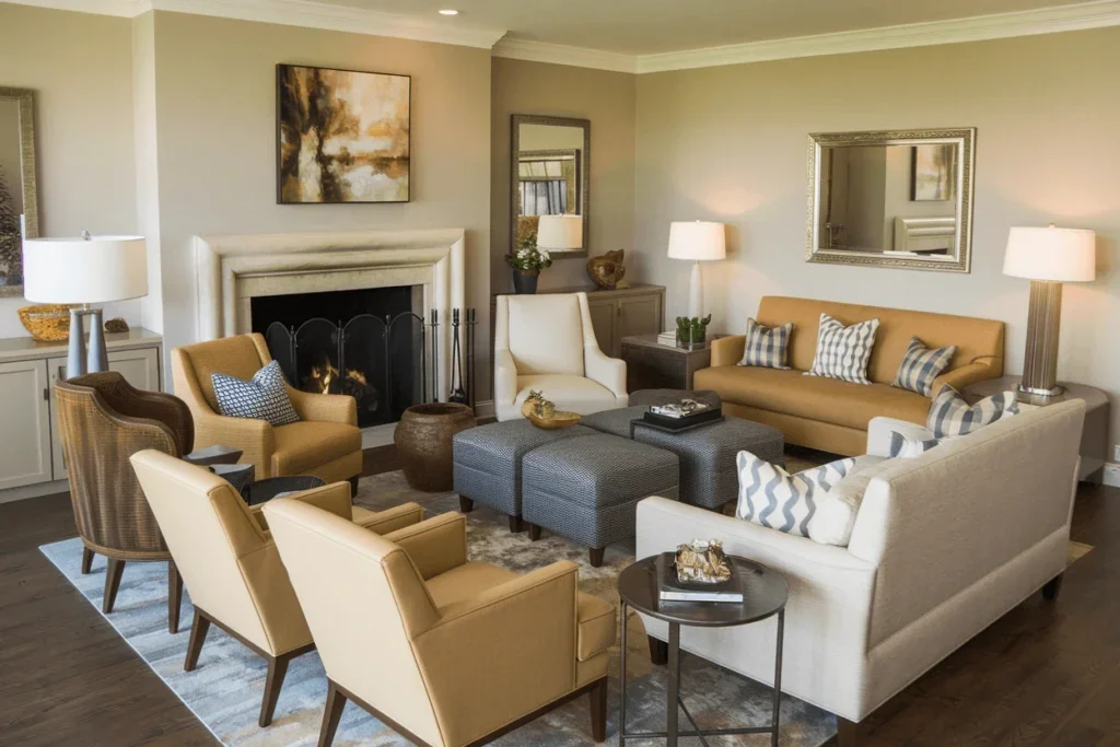 الأثاث المنزلي ضمن أحدث تصاميم صالات استقبال يعتمد على أرائك باللون الكريمي أو الرمادي الفاتح، مع إضافة وسائد أو إكسسوارات ذهبية وبرونزية. كما يمكن تنسيق طاولة جانبية زجاجية بقاعدة معدنية مع إضاءة جانبية بلون ذهبي ناعم، مما يضيف دفئًا وإشراقًا للصالة.
