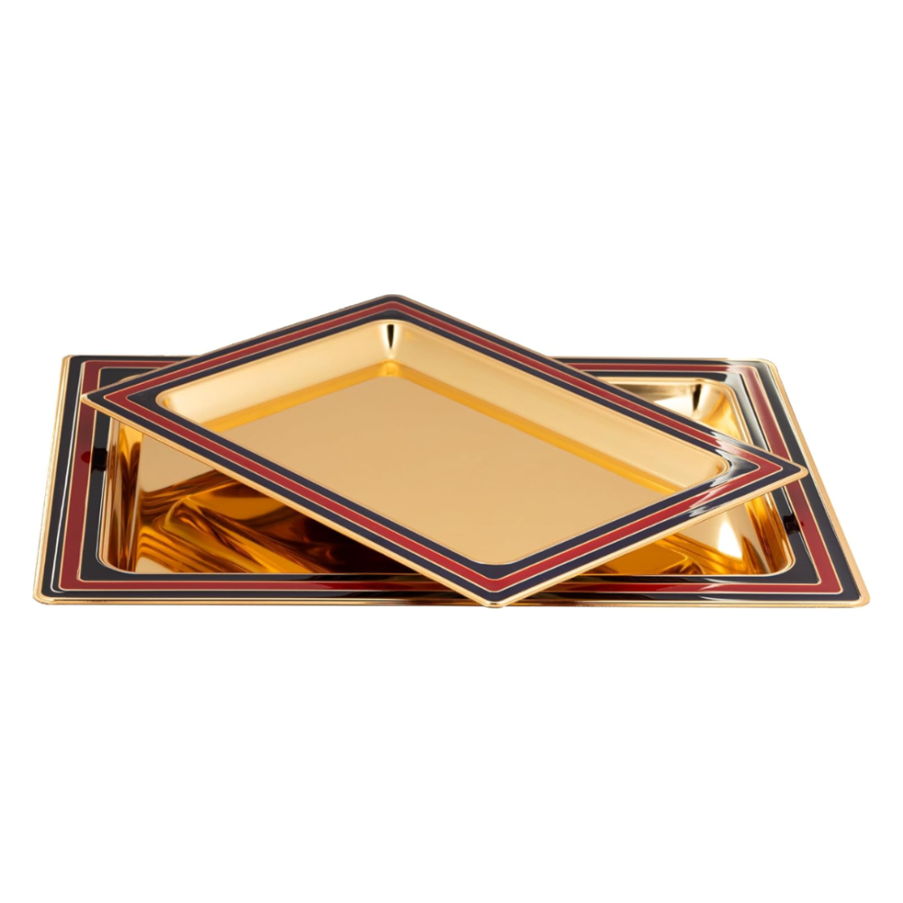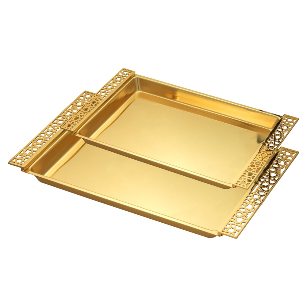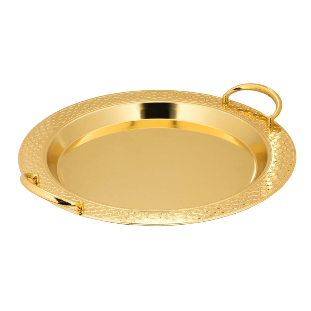 هذه الصواني تضيف لمسة فخامة وعصرية للمناسبات الكبرى مثل حفلات الأعراس أو الولائم الرسمية. تتميز بالصلابة والمتانة، وغالبًا ما تأتي بتصاميم أنيقة مزخرفة بالذهب أو الفضة، مما يجعلها نقطة جذب على مائدة الضيافة. تستخدم بشكل خاص لتقديم المشروبات أو الحلويات الفاخرة. ومن أجمل صواني التقديم المعدنية الذهبية التي يقدمها لك ميساكي: