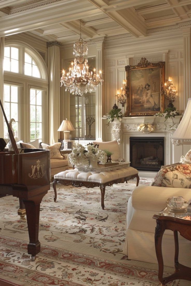 • إضاءة ناعمة وعتيقة: تُستخدم الإضاءة الناعمة مع الثريات الكريستالية والمصابيح المزينة بلمسات أنيقة لتعزيز الجو الدافئ.