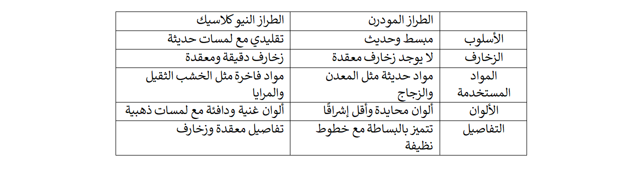 الجدول التالي يوضح لك بالتفصيل الفرق بين التصميم المودرن والنيو كلاسيك: