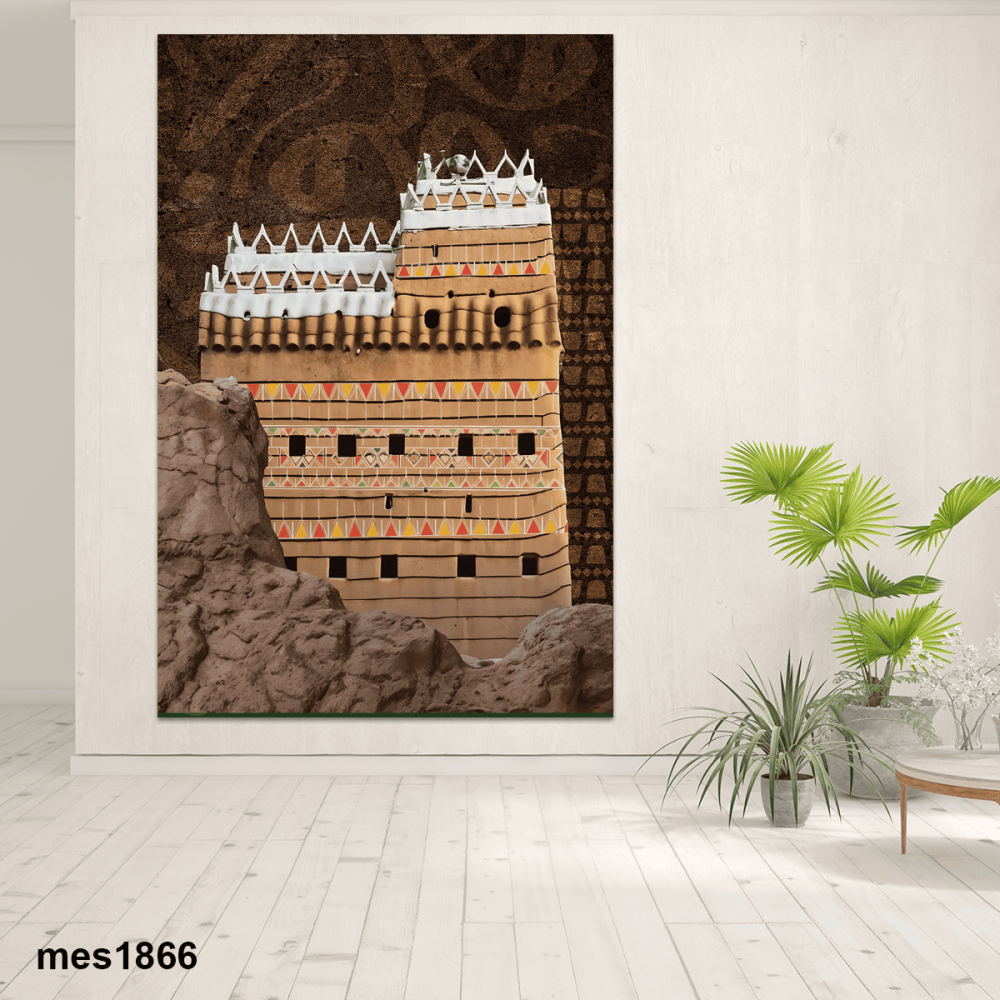 أحد اللوحات التراثية القديمة المميزة والتي تعكس تفاصيل العمارة القديمة من بيوت وقلاع مزخرفة، بأسلوب فني يوثق روح المكان التاريخي ويعيد تقديمه بشكل معاصر. عند إضافة لوحة جمال العمارة السعودية التقليدية تلك إلى الديكور، تمنح الجدار عمقًا بصريًا وإحساسًا بالاستمرارية التاريخية، وكأنها نافذة على الماضي داخل مساحة حديثة.