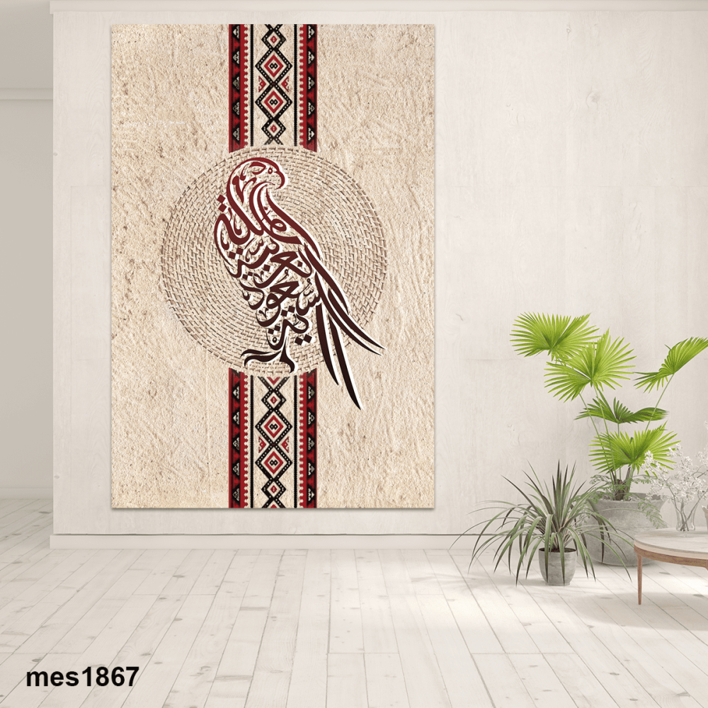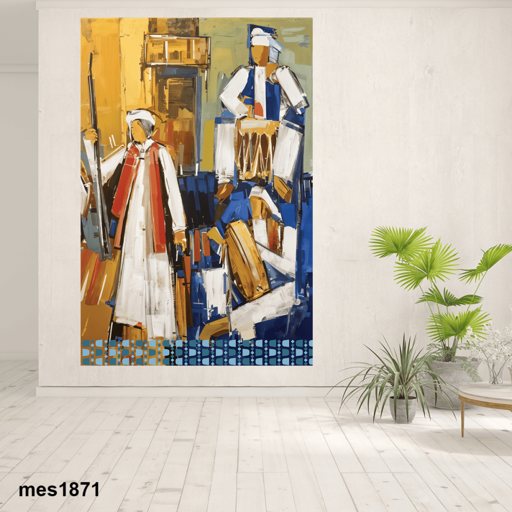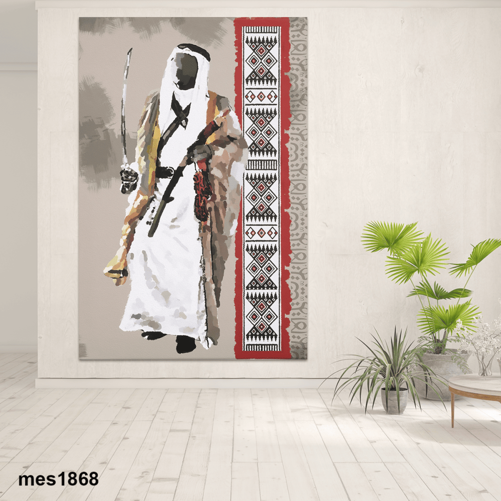 أحد أروع لوحات جدارية تراثية فخمة على الإطلاق، فهي تقدم شخصية عربية تراثية تحمل السيف كرمز للفروسية والشجاعة، محاطة بنقوش بدوية تضيف طابعًا أصيلًا للتصميم. كما أن وجود لوحة المحارب العربي بالسيف في المجلس أو غرفة المعيشة يمنح المكان قوة وحضورًا واضحًا، ويحوّل الجدار إلى عنصر فني يعكس الهيبة والتميز في نفس الوقت.