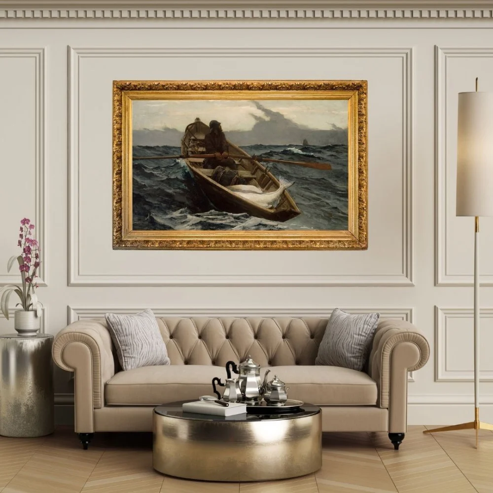 تصوّر اللوحة صيادًا وسط أمواج البحر مع اقتراب الضباب، وهي مليئة بالدراما والتفاصيل الواقعية. الألوان الغامقة والموضوع العميق يخلقان جوًا كلاسيكيًا فخمًا يناسب غرف النوم ذات الأثاث الخشبي الثقيل والأقمشة المخملية. وهي من أفضل لوحات جدارية لغرف النوم للفنان هوميروس، تسوقها الآن بأفضل سعر عبر ميساكي من هنا.