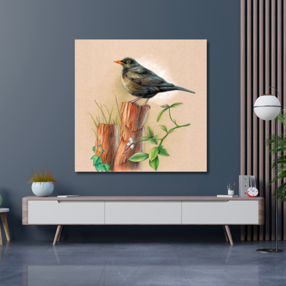 - لوحة كنفاس جدارية مطبوعة لطائر صغير يقف على غصن شجرة ليغرد بأجمل الألحان.