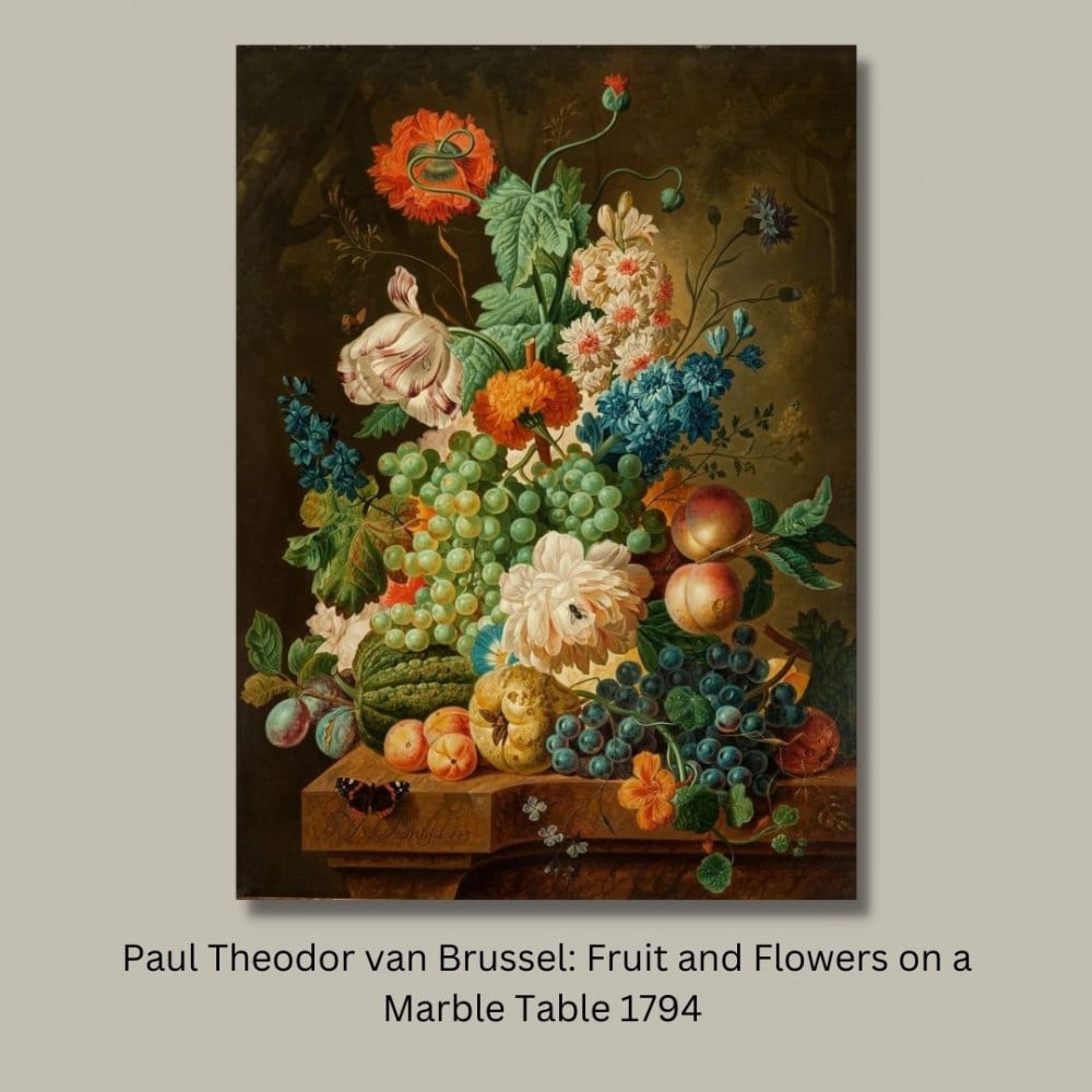 لوحة باسم (Fruit and Flowers on a Marble Table) لوحه رسمها بول تيودور فان بروسل 1794