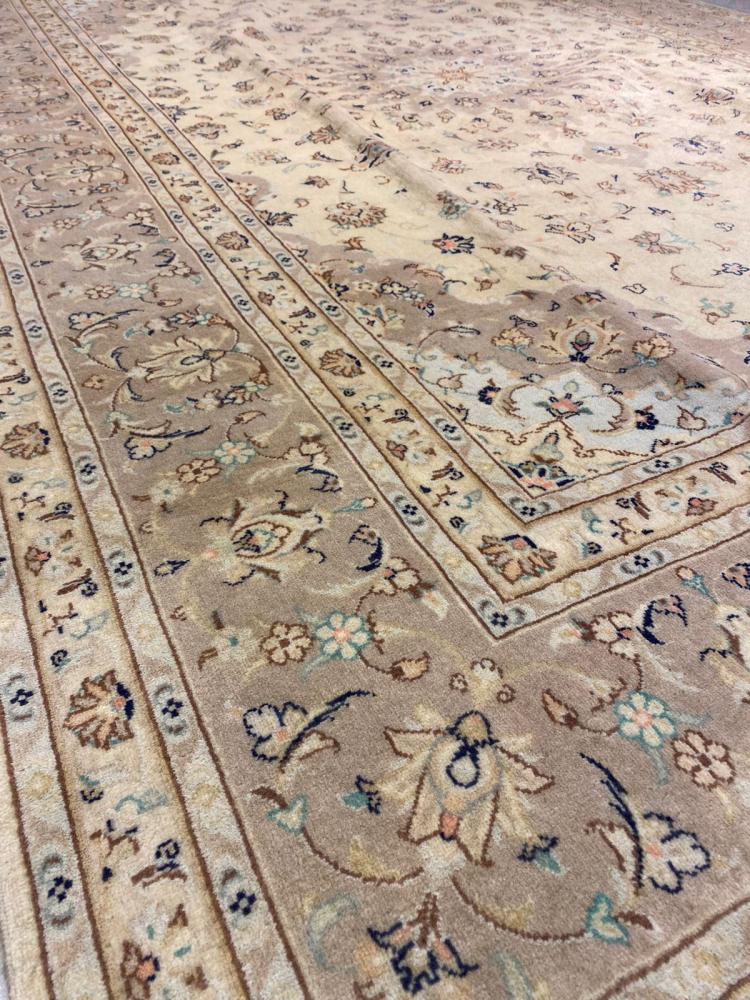 مدينة كاشان، الواقعة في قلب إيران، تُعد واحدة من أعرق مراكز صناعة السجاد اليدوي، حيث تُنتج نوعين مميزين من السجاد: الحرير والصوف، وكل منهما يعكس جمال التراث الإيراني بطريقة فريدة. سجاد كاشان المصنوع من الحرير يُعتبر رمزًا للفخامة والأناقة، حيث يتم نسجه بالكامل من الحرير الطبيعي، مما يمنحه لمعانًا براقًا وملمسًا ناعمًا، مع تصاميم غنية بالتفاصيل الدقيقة تشمل مداليونات مركزية وزخارف زهرية ونباتية مستوحاة من الفن الإيراني الكلاسيكي. تتميز هذه القطع بكثافة عقد عالية جدًا، تصل إلى 800,000 إلى 1,200,000 عقدة لكل متر مربع، ما يسمح بإبراز أدق التفاصيل وإظهارها بأسلوب فني مذهل، بينما تُستخدم الأصباغ الطبيعية لتلوين السجاد بألوان مشرقة تدوم طويلاً دون أن تبهت.