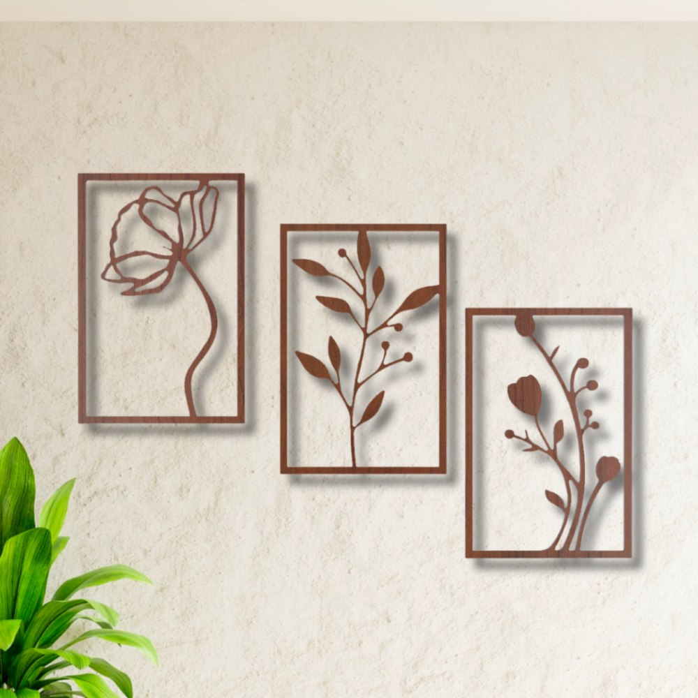 طقم من 3 منحوتات خشبية لوحة ديكور - ورود
