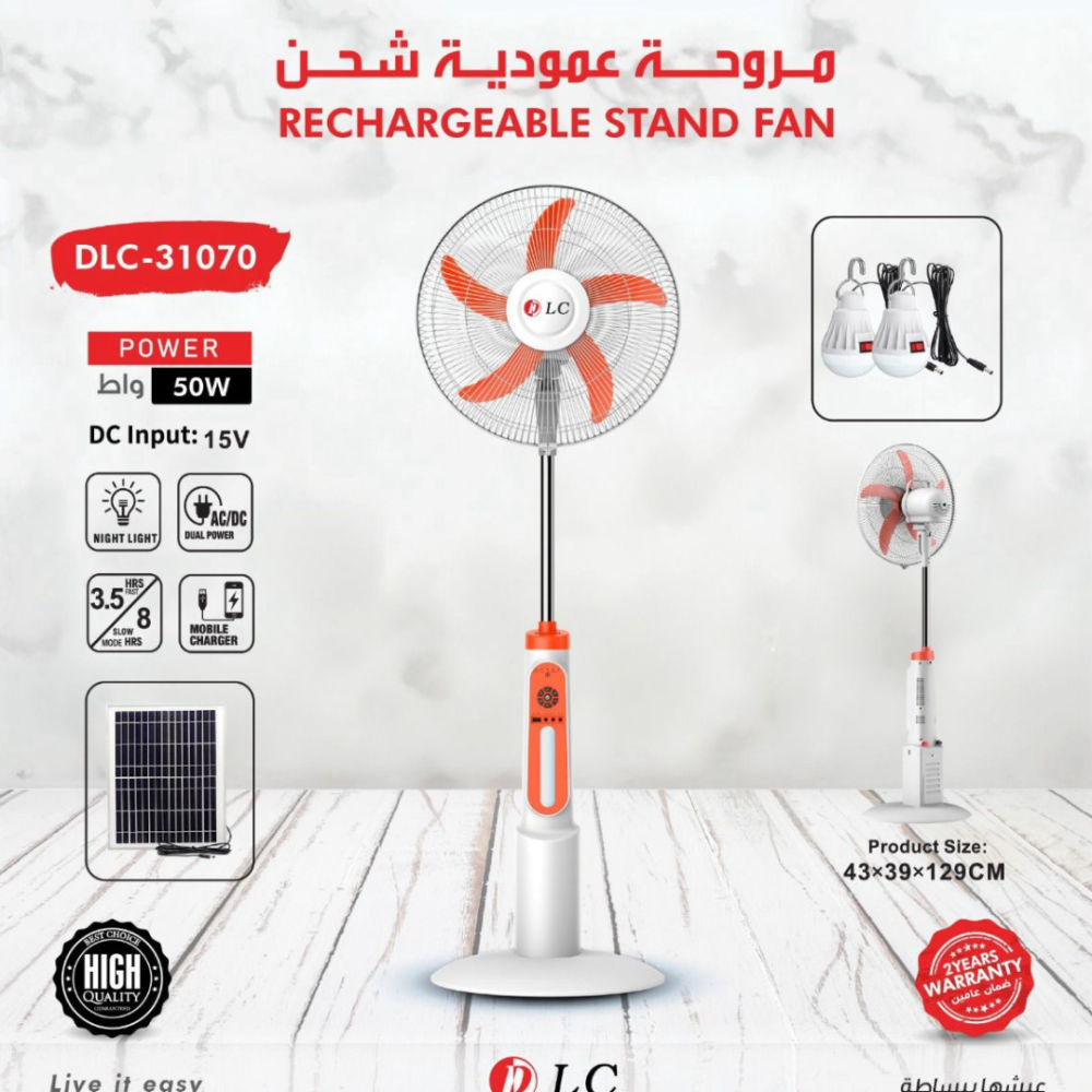 مروحة كهربائية عمودية قابلة للشحن أو التشغيل بالطاقة الشمسية من دي ال سي – 50 واط