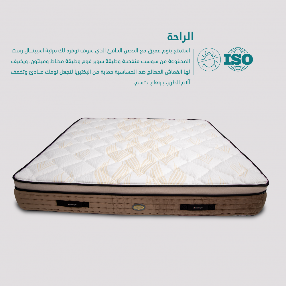 مرتبة سرير اسبينال رست، توفر الراحة المثالية بفضل تصميمها الرائع والمريح، تعد اختيارًا مثاليًا للأشخاص الذين يعانون من مشاكل النوم بسبب الأرق أو الألم، كما تعد استثمارًا جيدًا لصحة الجسم والعافية العامة.