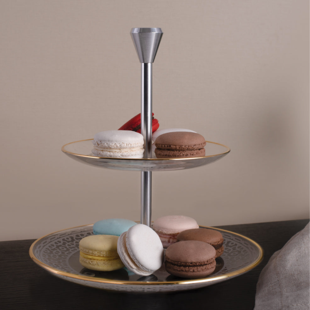 صينية تقديم زجاجية مذهبة طابقين بزخرفة فاخرة مستوحاة من الفنون الشرقية القديمة