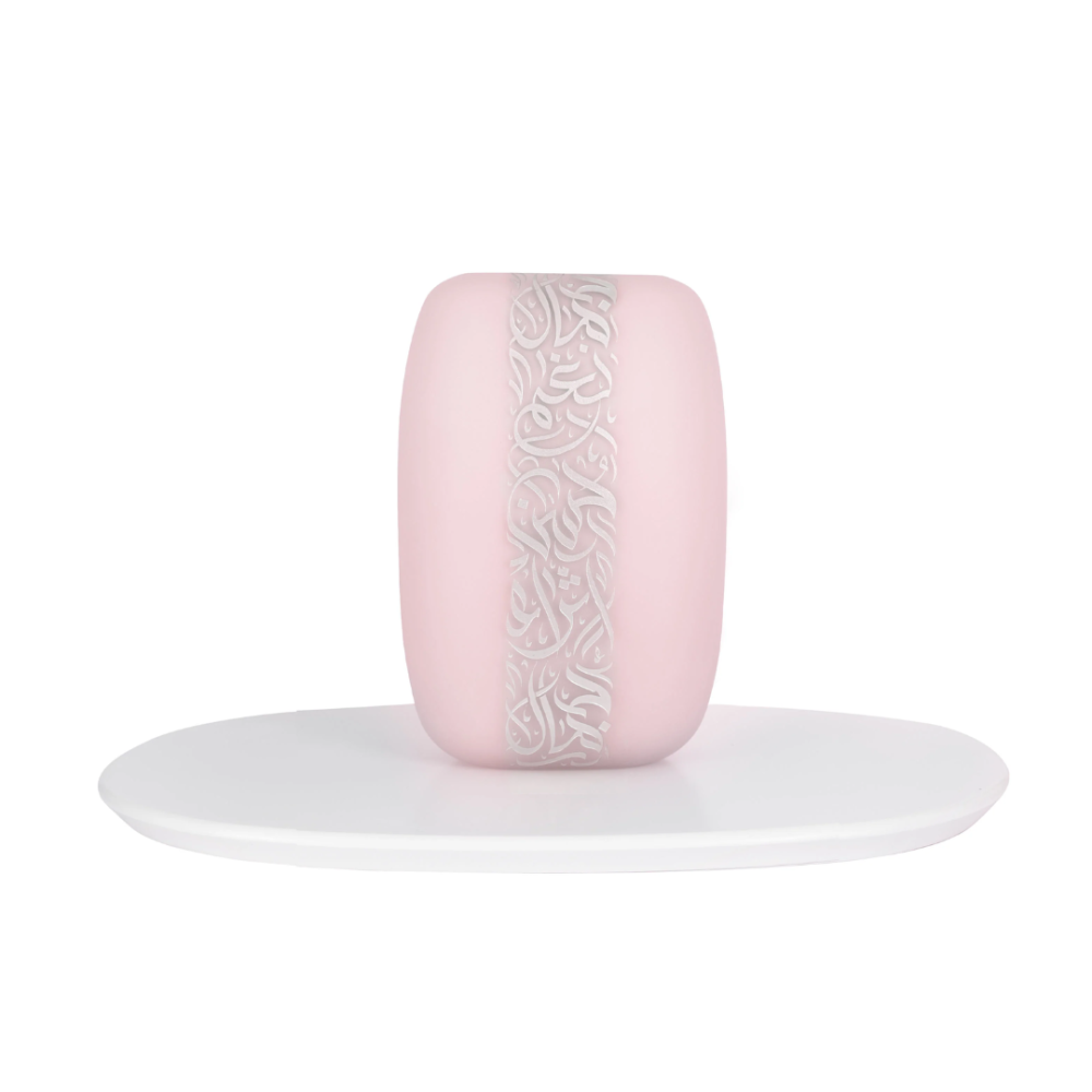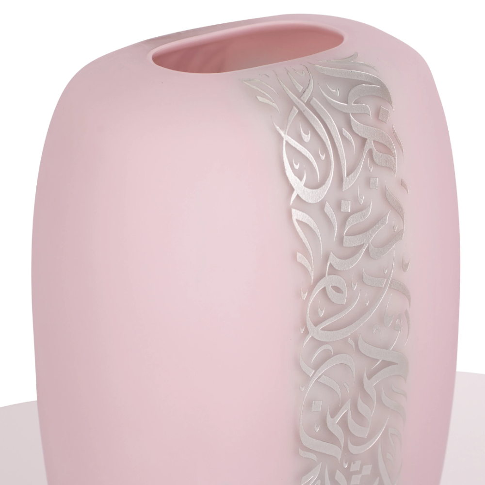 مزهرية زجاجية وردية فاخرة بزخفة بلاتينية انيقة من الخط العربي