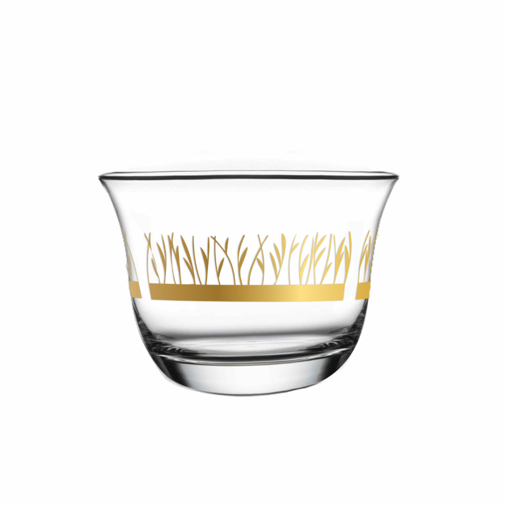 طقم فناجين قهوة عربية زجاجية مذهبة بزخرفة انيقة مستوحاة من الطبيعة