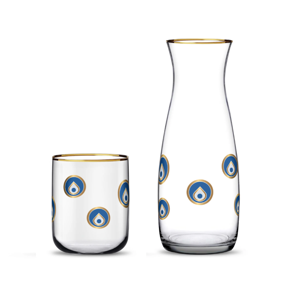 طقم شراب زجاجي فاخر مذهب بزخرفة لون ازرق عصرية وانيقة