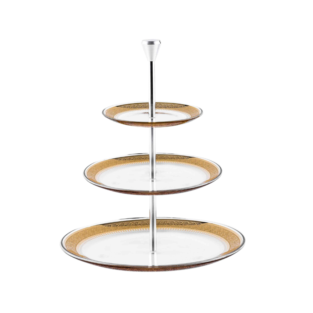 صينية تقديم زجاجية ثلاث طبقات مذهبة بزخرفة انيقة مستوحاة من الطراز الاندلسي