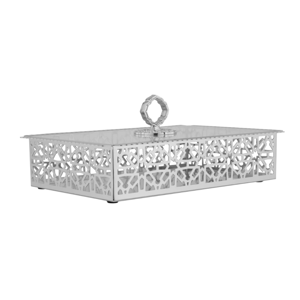 صينية تقديم مستطيلة تصميم مخرم من السيف - لون فضي - متوفرة بمقاسين
