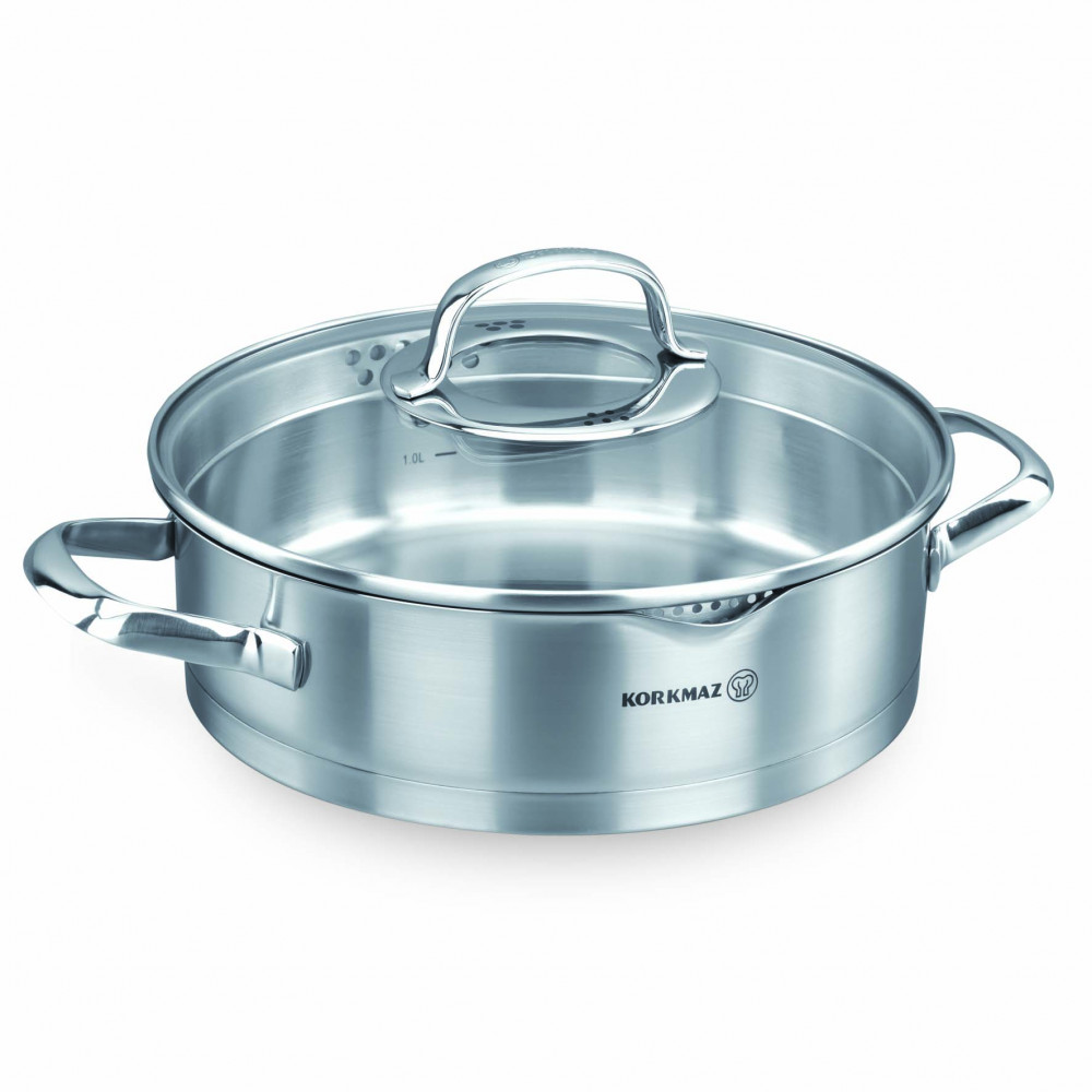 Korkmaz Stima Flat Pot 24cm 3L Size: 24X7cm/3L with lid. Stainless steel superior triple-layer capsule base for uniform heat conduction. External surfaces are carefully polished to maintain their shine. Safety glass lid with special strainer. Provides easy filtration of liquids thanks to the strainer. Suitable for cooking without water or fat. Wash with hot water and dishwashing soap before using it for the first time. Do not leave it on the stove for a long time when there is no food in it that is free of water or fat. Do not use a rough or metal brush when cleaning. Dishwasher safe. Compatible with stoves: gas, electric, induction, glass-ceramic, halogen.