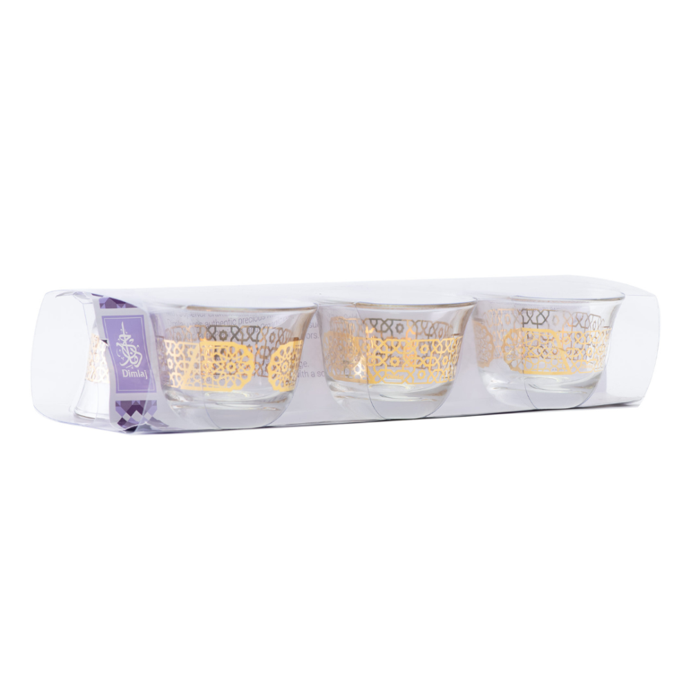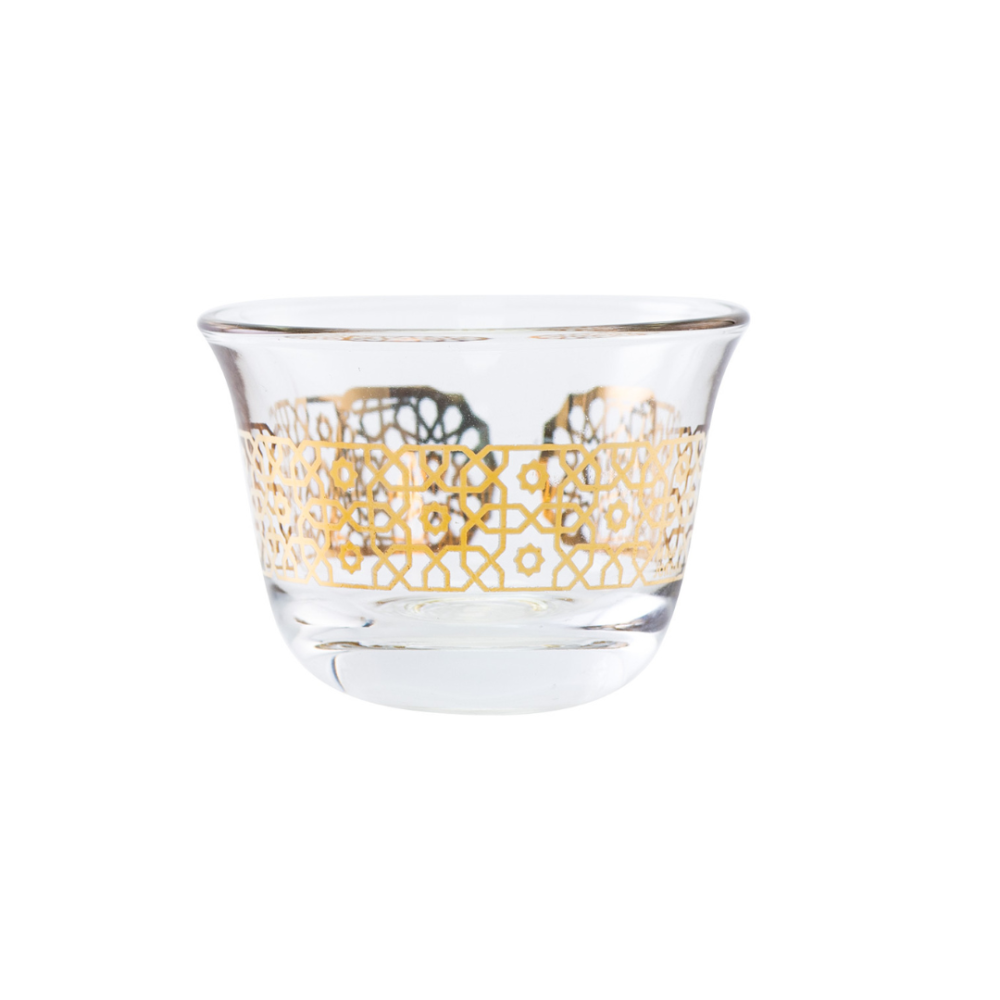 طقم فناجين قهوة عربية زجاجية مذهبة بزخرفة هندسية انيقة