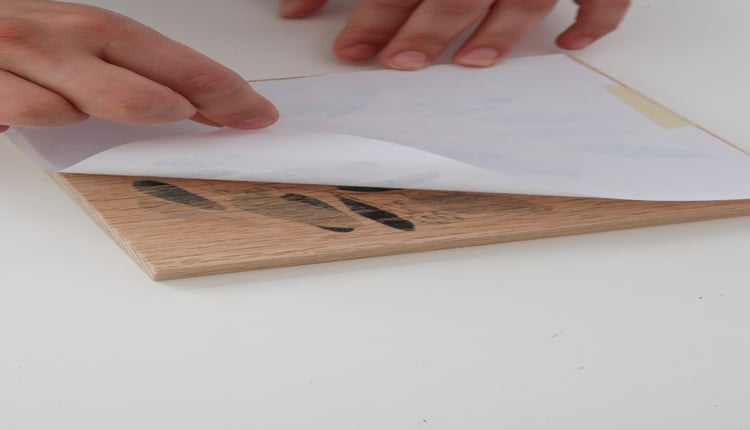 بعد ذلك قُم بتوزيع مادة الأسيتون على الورقة التي ترغب بطباعة ما فيها على الخشب بحيث تتشرب الورقة المادة بالكامل، وبعد التحقق من أن الورقة تشرب المادة جيداً قُم برفع الورقة شيئاً فشيئاً وستجد أن الورقة تم نقل ما موجود بها سواء صورة أو عبارة مباشرة إلى اللوحة الخشبية.