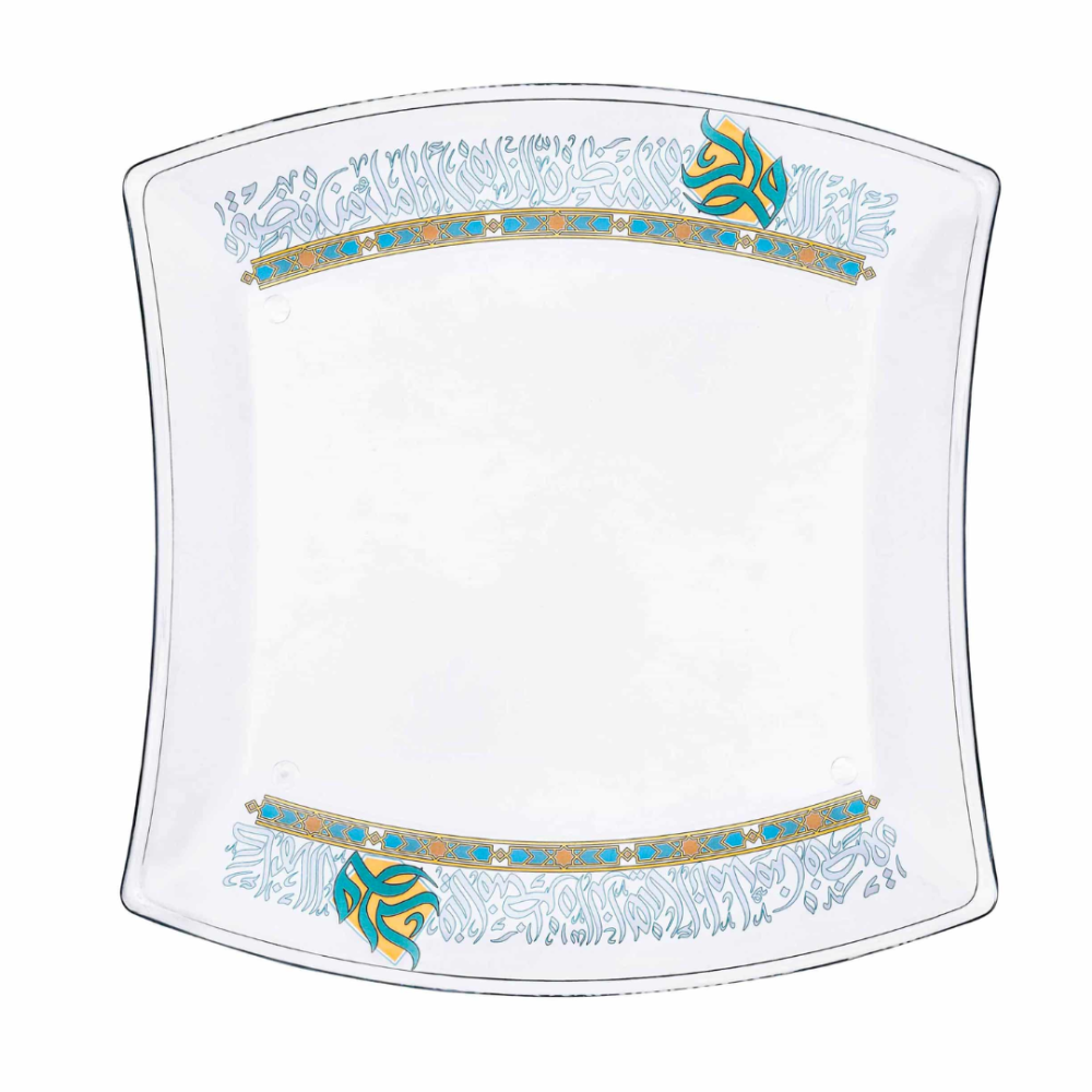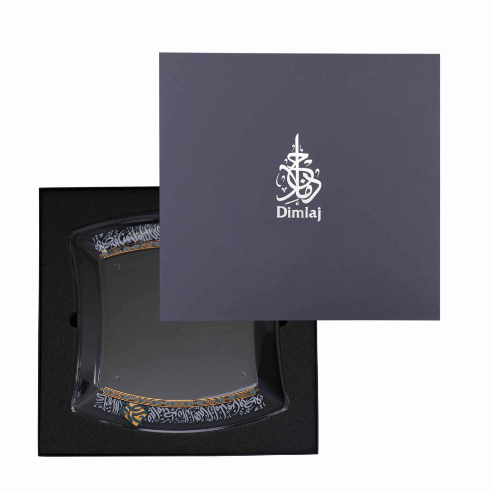 صحن تقديم زجاجي فاخر شكل مربع مذهب بزخرفة عريقة من الخط العربي