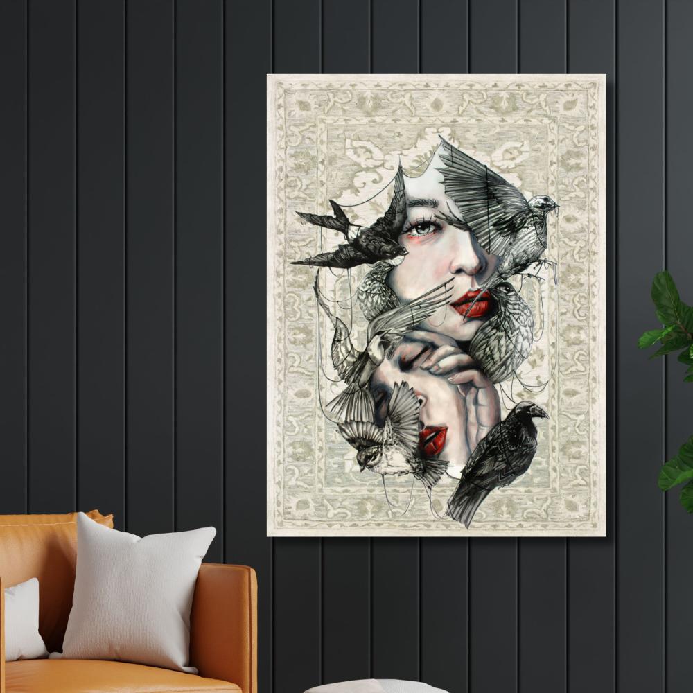 لوحة جدارية مطبوعة بخلفية سجاد وكولاج صورة وجه امرأة