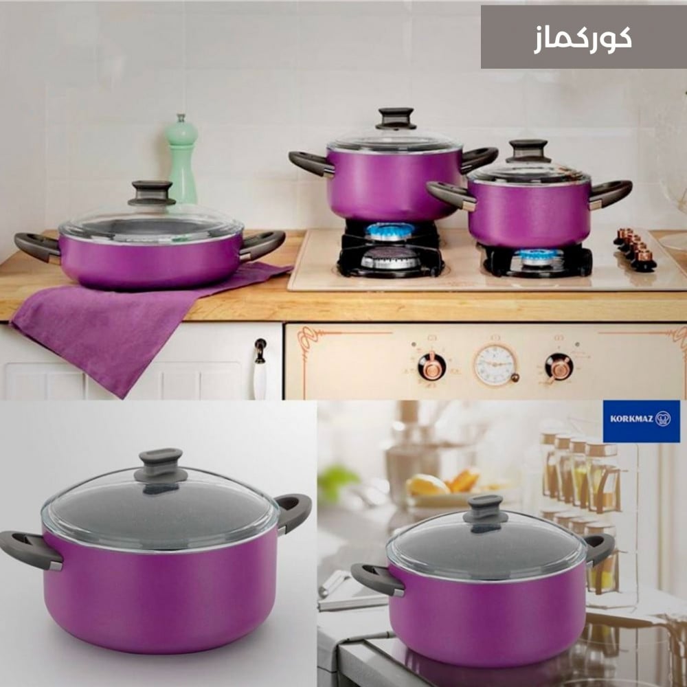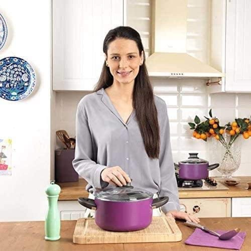Korkmaz Lina Purple Pot Sizes: Size: 20*10.5 cm / 3 liters Size: 22*11 cm / 3.8 liters Size: 2024*12.5 cm / 5 liters Size: 26*13 cm / 7 liters Size: 28*15 cm / 9 Liter size: 30*15 cm / 10 liters. Covered with an excellent PTFE granite coating. Non-stick on internal and external surfaces. Easy to clean. Additional scratch resistance. Provides high temperature delivery even at low temperatures Helps provide high-performance and delicious cooking compared to other types of pots Provides delicious food using less oil Environmentally friendly and made from recyclable materials